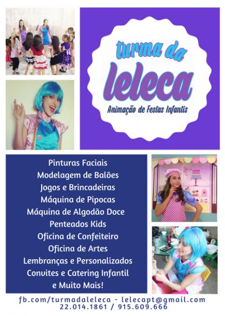 Descrição: A Turma da Leleca é uma equipa pronta para animar a festinha dos seus filhos! Contamos com profissionais qualificados e cheios de alegria! Temos experiência e especialização no Brasil e em Portugal.